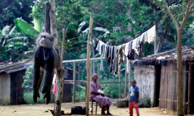 A dead monkey sold as bushmeat hangs outside a villager’s house in north-east Gabon. Photograph: Christine Nesbitt/AP